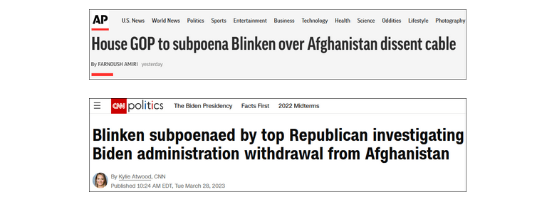 据悉,去年年底美国众议院议长麦卡锡上台前曾有三项承诺,要对拜登政府发难,其中一项就是追责美国政府阿富汗撤军问题。在2021年拜登上台后下达了阿富汗美军撤出的命令,尽管共和党官员极力反对,刚下台的前总统特朗普也多次指责,五角大楼最后还是完成了撤军任务。两年来在参众两院、白宫都被民主党把持的情况下,反对撤军的共和党问责无门;所以麦卡锡在中期选举刚获胜后就迅速承诺了这项“报复行动”,也为现在的局面做了充分铺垫。